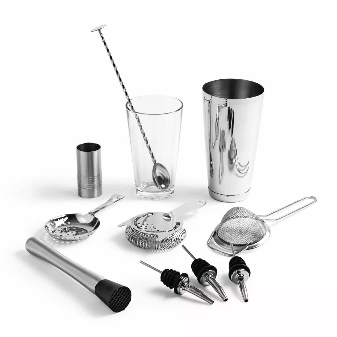 Bonzer have used their years of experience with the bar trade to create this stunning bar kit, that includes everything you need to run a successful cocktail party. This bonzer cocktail bar kit contains; a 25/50ml jigger, three spill-stop pourers, a muddler, Boston can and glass, a mixing spoon, hawthorne strainer, julep strainer and fine bar strainer.