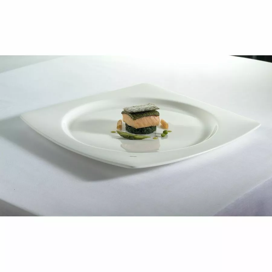 Elia Glacier Square Plate. This Item is a part of the Glacier range – Pure dining elegance, be it in a classic or contemporary setting. Featuring gentle curves in a soft creamy glaze, Glacier co-ordinates perfectly with Elias Orientix range , The Elia Premiere Bone China Collection comprises distinctive shapes and designs, which all share the same creamy white glaze and smooth as silk finish. The ranges are fully interchangeable to create a bespoke and unique tabletop. All items are fully vitrified, microwave and dishwasher safe, providing elegance and style with the assurance of quality and durability
