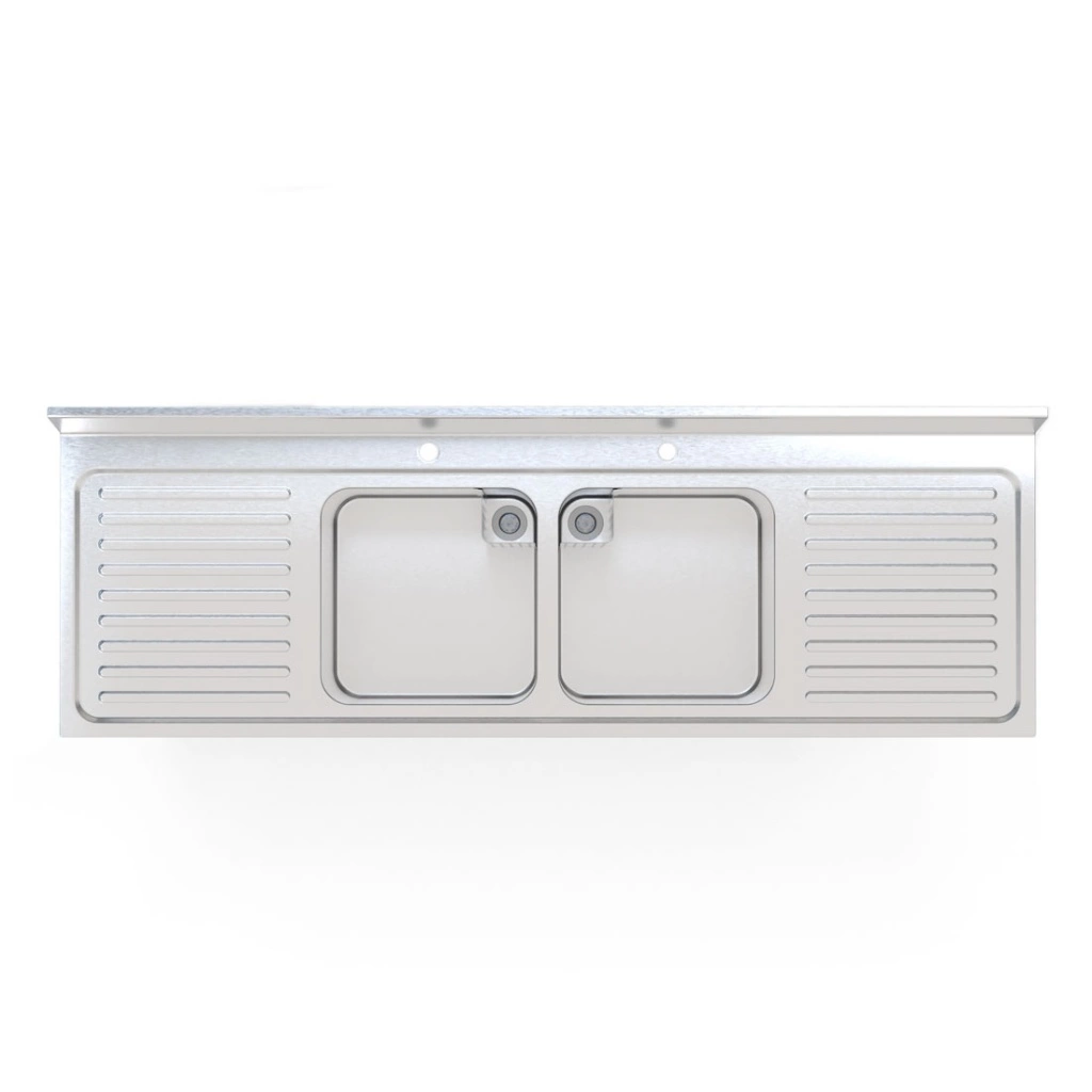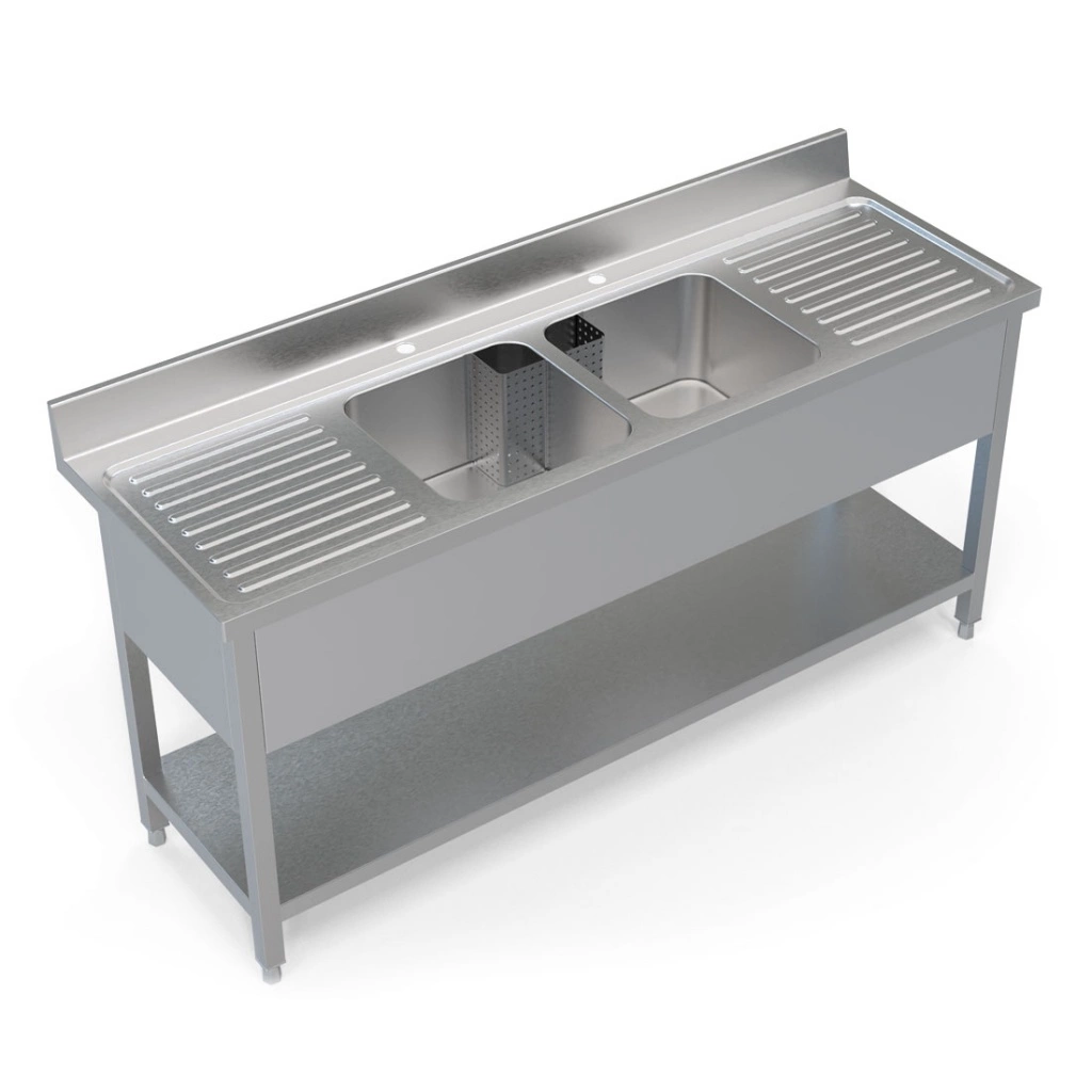 This sink comes complete with corner drainers and strainers. The 38mm square legs have adjustable feet and are stepped in 100mm from the back to allow for pipework. Finishing off the sink is a stainless steel valance for a clean, professional look. Also included are stand pipes for each bowl.