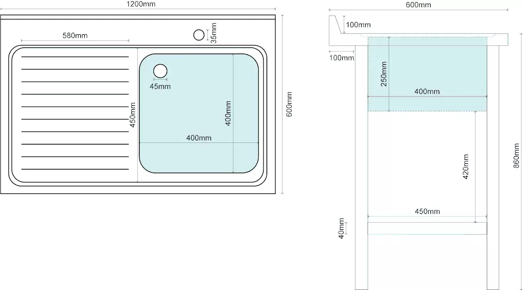 This sink comes complete with corner drainer and strainer. The 38mm square legs have adjustable feet and are stepped in 100mm from the back to allow for pipework. Finishing off the sink is a stainless steel valance for a clean, professional look. Also included is a stand pipe.