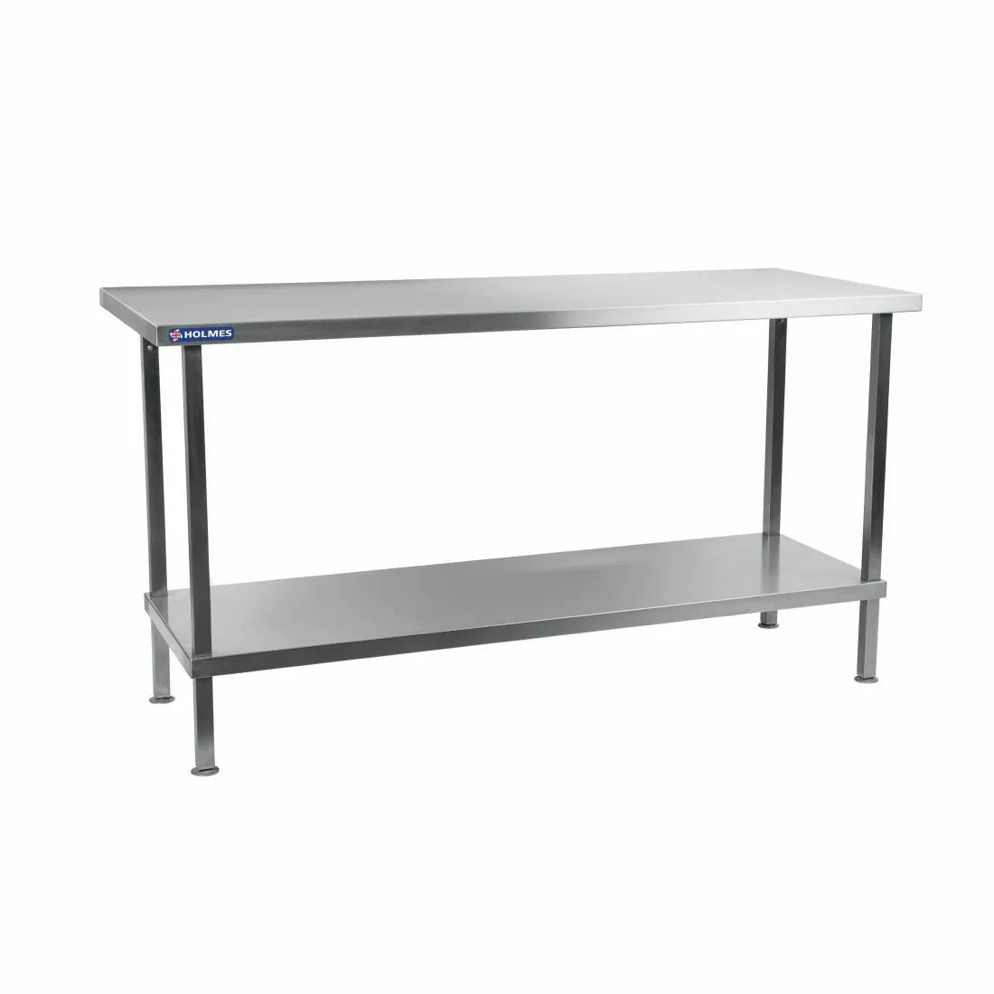 This 2100mm wide Holmes centre table makes a strong foundation to any commercial kitchen, thanks to a high quality stainless steel construction and smooth worktop that is both highly resistant and easy to clean. As a central island, the table allows several staff members access at once, increasing the kitchen’s working capacity and maximising your use of space. The adjustable metal flange feet also ensure extra stability and an even surface, designed to support heavy appliances, tools and accessories as well as provide a suitable food preparation area.