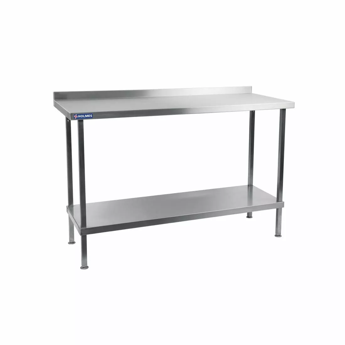 This 90cm wide table from British company Holmes is manufactured in York by expert craftsmen. With a reputation for excellent reliability and quality, Holmes tables feature in some of the world’s most demanding kitchens, including Windsor Castle. Featuring a 50cm upstand to protect against splashes and spillages, this table comes with convenient adjustable feet and a full width storage undershelf.