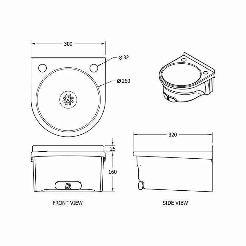 - Basin dia.: O/D: 300 x 320 x 160mm. Bowl: 260mm dia. X 130mm deep