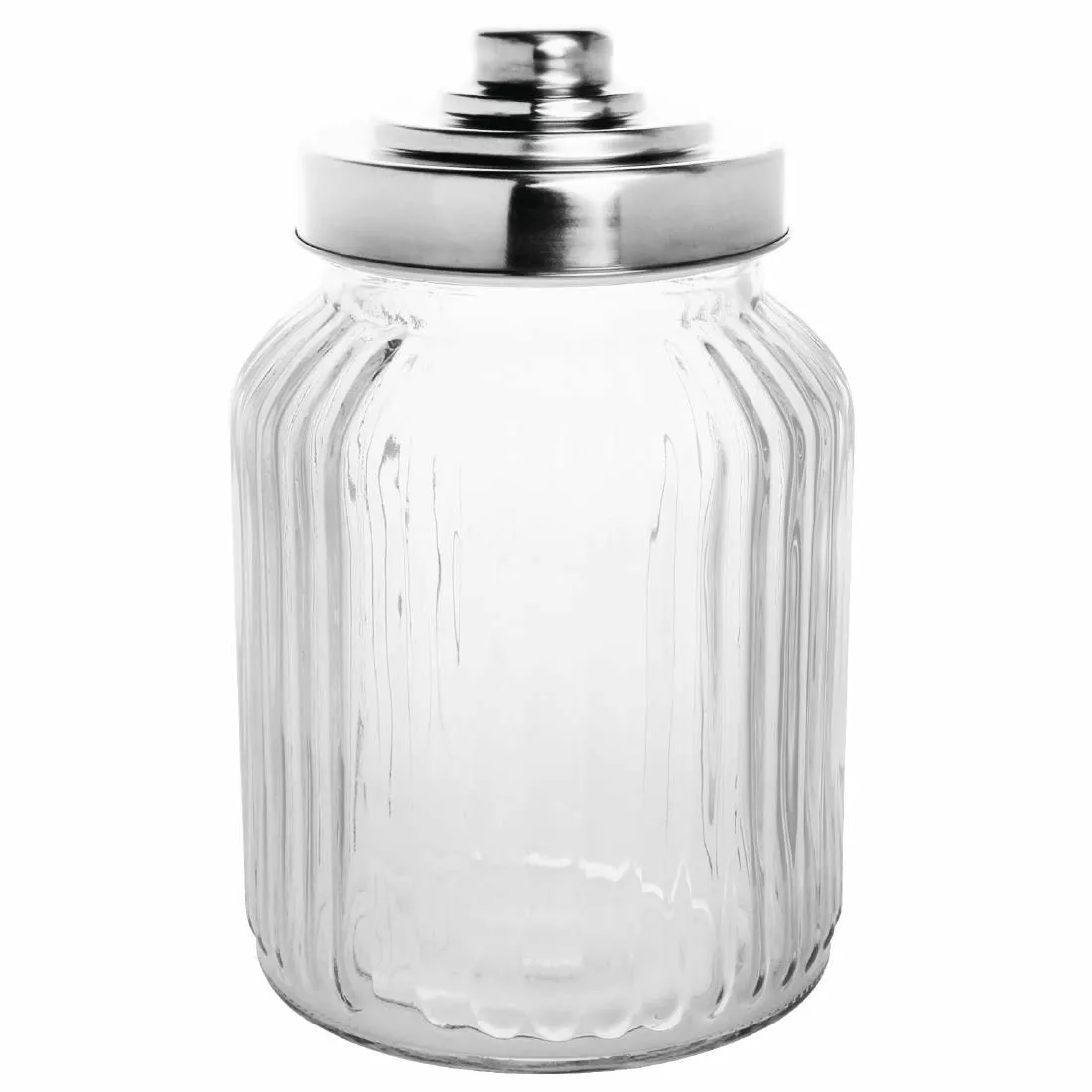 Add an element of vintage style to your kitchen or bar with this ribbed glass storage jar (900ml). The screw on, durable stainless steel lid is airtight, keeping contents fresher for longer and therefore lowering your levels of waste. The 900ml size of the jar is a decent size, allowing you to store more inside and save money on buying multiple jars. This jar is an ideal container for storing confectionary or preserves and the ribbed vintage-style ribbed glass looks great on any kitchen or bar shelf.