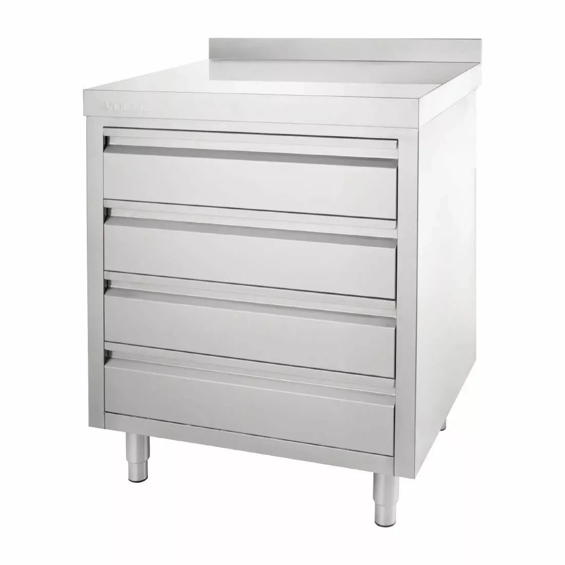 Four-drawer stainless steel unit with 60mm upstand. 900 mm high (not including upstand), 700mm wide and 600mm deep.