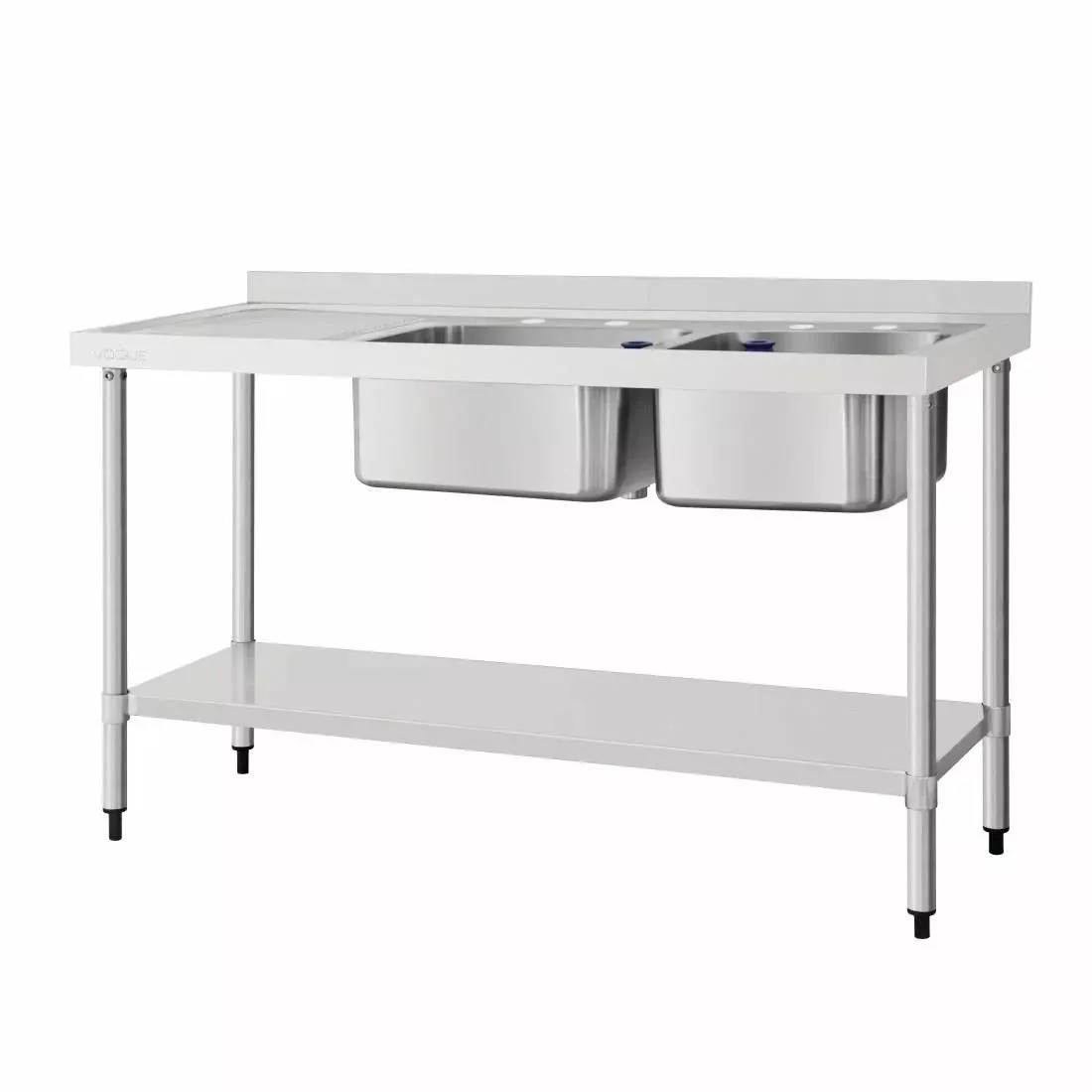 Create an efficient and hygienic kitchen environment with this 1500mm wide double bowl sink unit from Vogue. The sink is made from a stainless steel material that allows easy cleaning and giving it the durability to withstand daily use in any busy commercial kitchens. The unit also features an under shelf that provides of extra storage space for a variety of cleaning chemicals, equipment and other items.