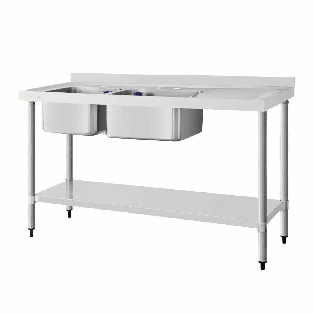 Functional and versatile, the 1500mm wide double bowl sink from Vogue is ideal for any busy commercial kitchen; allowing you to soak or rinse dishes in one sink whilst cleaning in the other. The sinks are supplied with two standpipes, that stop water from draining during cleaning tasks, and prevent large waste products from blocking your drains – saving you money on plumbing bills. The plugholes are situated in the corner on the sinks which aids in reducing the risk of broken kitchen or tableware.