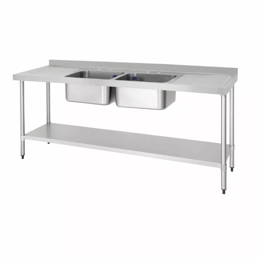 Improve your cleaning facilities, with the Vogue double sink with double drainer. The sink is constructed from a highly durable and easy to clean stainless steel material, that helps to save you money on replacements or maintenance and time spent on cleaning. The sinks can be used to efficiently clean a wide variety of table or glassware – with the ability to use one sink for cleaning and the other for rinsing.